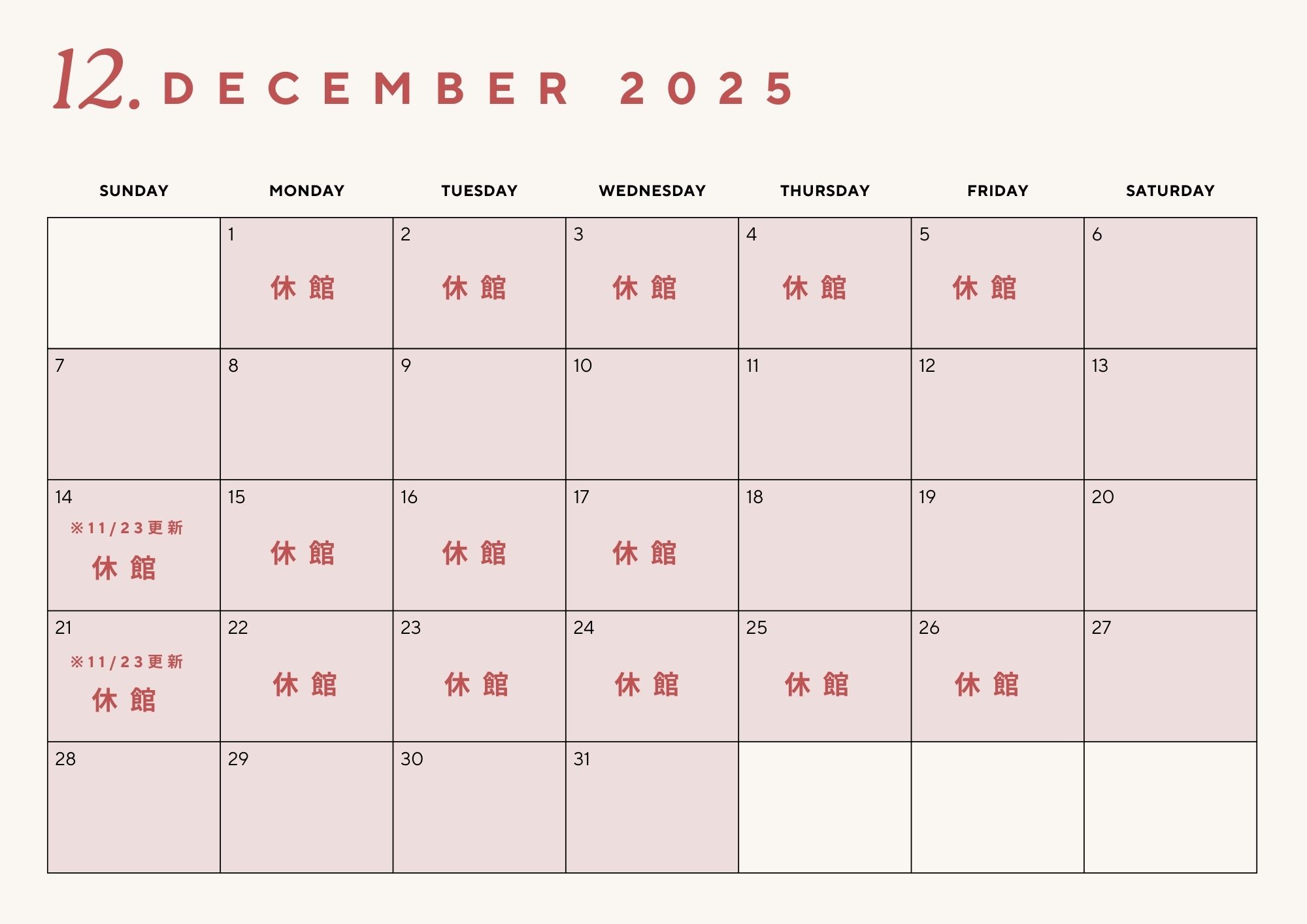 休館のご案内(2025年11月・12月 / 2026年1月) 2025.11.23更新