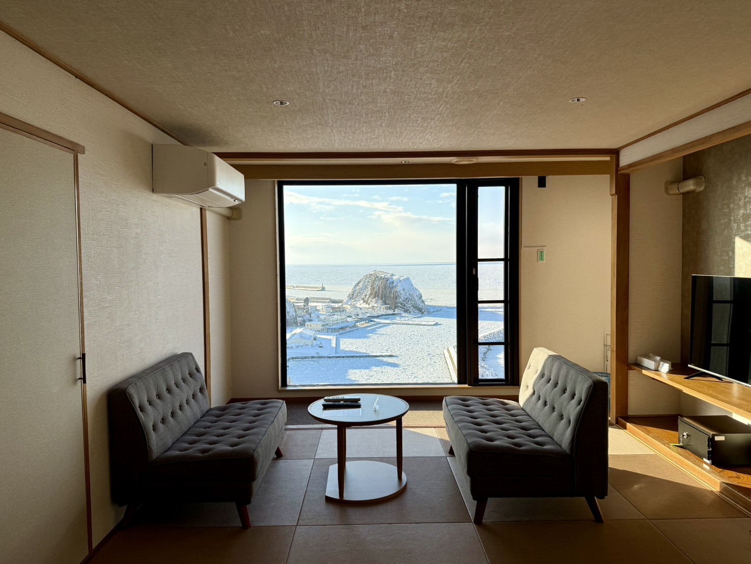 夕陽のあたる家は、全室オーシャンビューのため、すべての客室から流氷の景色をお楽しみいただけます。ラウンジや大浴場・サウナからも。ぜひ当館ご利用の際は、この景色を満喫されてください。